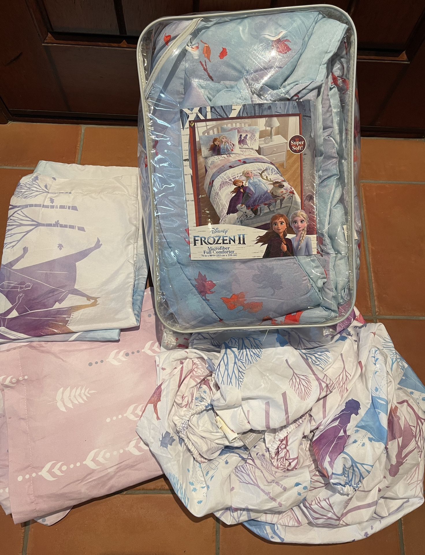 Like new. Comforter never used. Frozen 2. Reversible Comforter - Forest scene with Elsa and Ana, other side just forest scene with fall leaves. 5 pieces