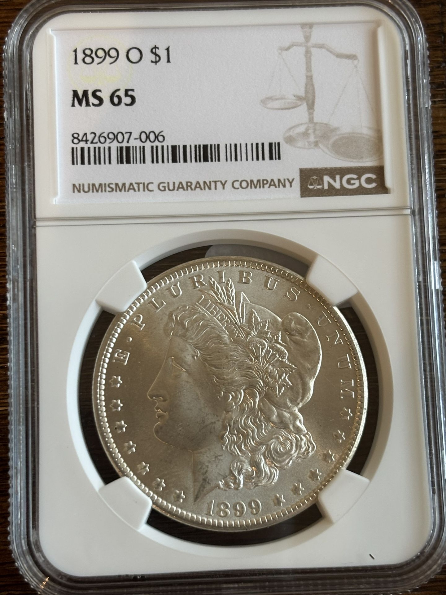 $425 For sale is an 1899-O Morgan Silver Dollar, professionally graded MS65 by NGC. • Original New Orleans mint Morgan dollar • High-grade Mint State 65 • Fully authenticated & encapsulated by NGC • Bright luster with clean fields for the grade • Extremely liquid, popular date/grade combo This is a solid, problem-free MS65 Morgan — not a cleaned or raw coin. Comparable pieces sell in the low-to-mid $400s. Payment / Terms: • Cash only • Local, in-person sale • Public meeting place (bank or police station preferred) • No trades If the ad is up, the coin is available. Serious buyers only.