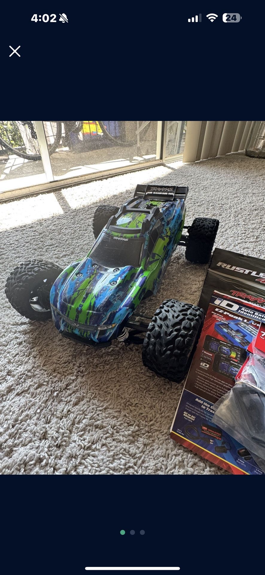 Needs a new shock cap separate tooth gears still in packages Extra springs Spacers Wheelie bar Metal hex hubs (2 extra) in package Manual Controller
