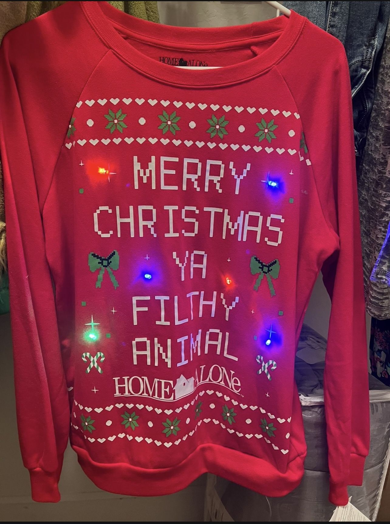 Brand new Size large juniors/women’s Licensed character brand Lights up Can wear with or without lights on Great for holiday party or as a good ugly Christmas sweater