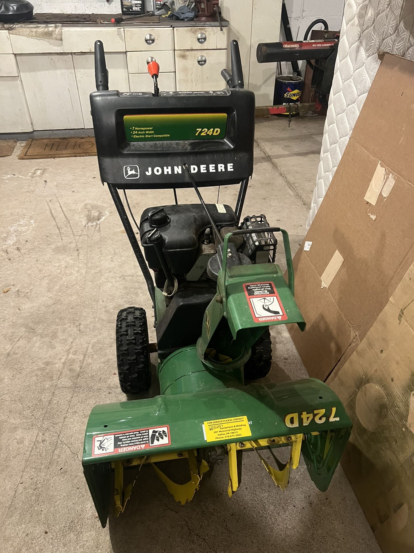 John Deere snow blower in excellent condition Runs great well taken care of barely used few times. 7 hp with 24 inch wide path. 6 forward gears with 2 reverse. $300.