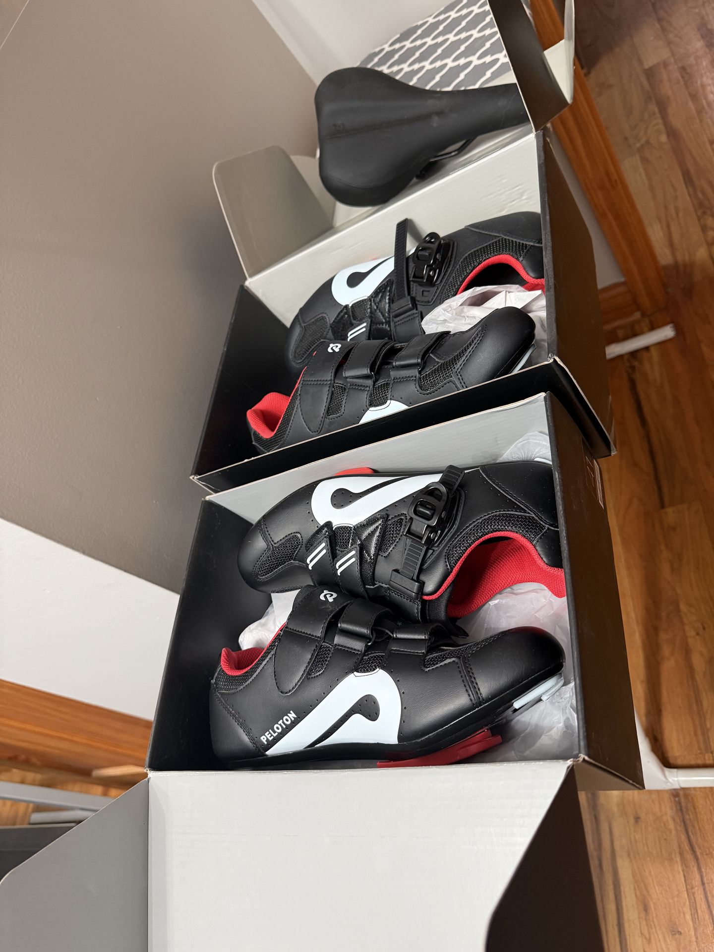 Brand New Peloton Sizes 41 (Women 10, Men 8) and 46 (Men 12) plus a bonus, Peloton Seat. Comes with whole set.