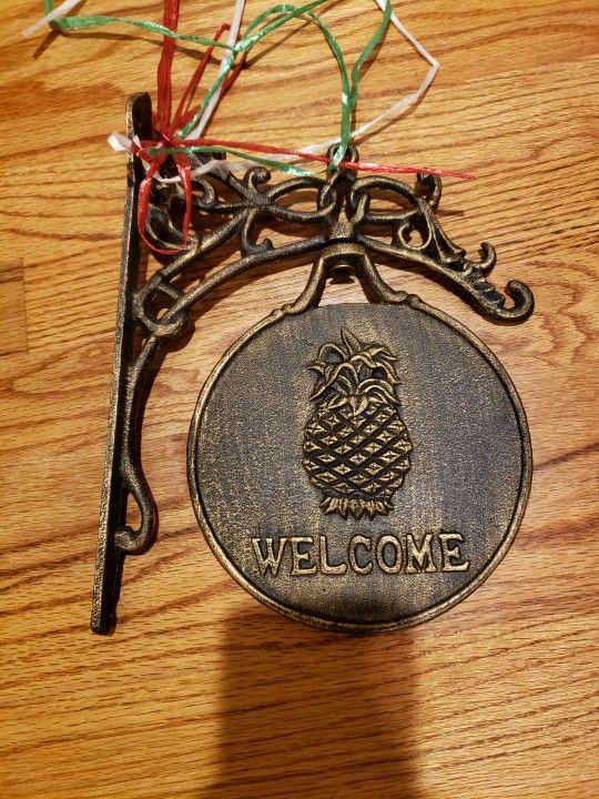 NWOT Metal "Welcome" Sign with Pinapple Approx measurements: 11" H x 8 1/4 W with center round "welcome" portion 6 1/2" Diameter Bought as a gift but never given/ hung (still has bow tied from purchase) Excellent Condition. See pictures for details. Local pick-up, Cash only please