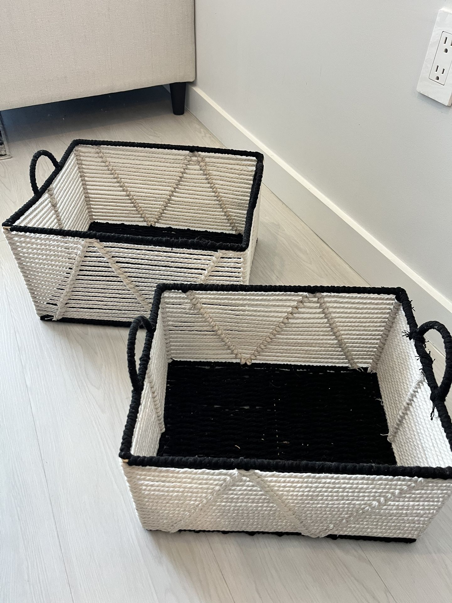 Stylish black and white woven baskets, perfect for organizing your home. Great for shelves, closets, or living spaces. Lightly used and in excellent condition. Dimensions: Approx. 13” x 10” x 7” Pickup only. Message me if interested!