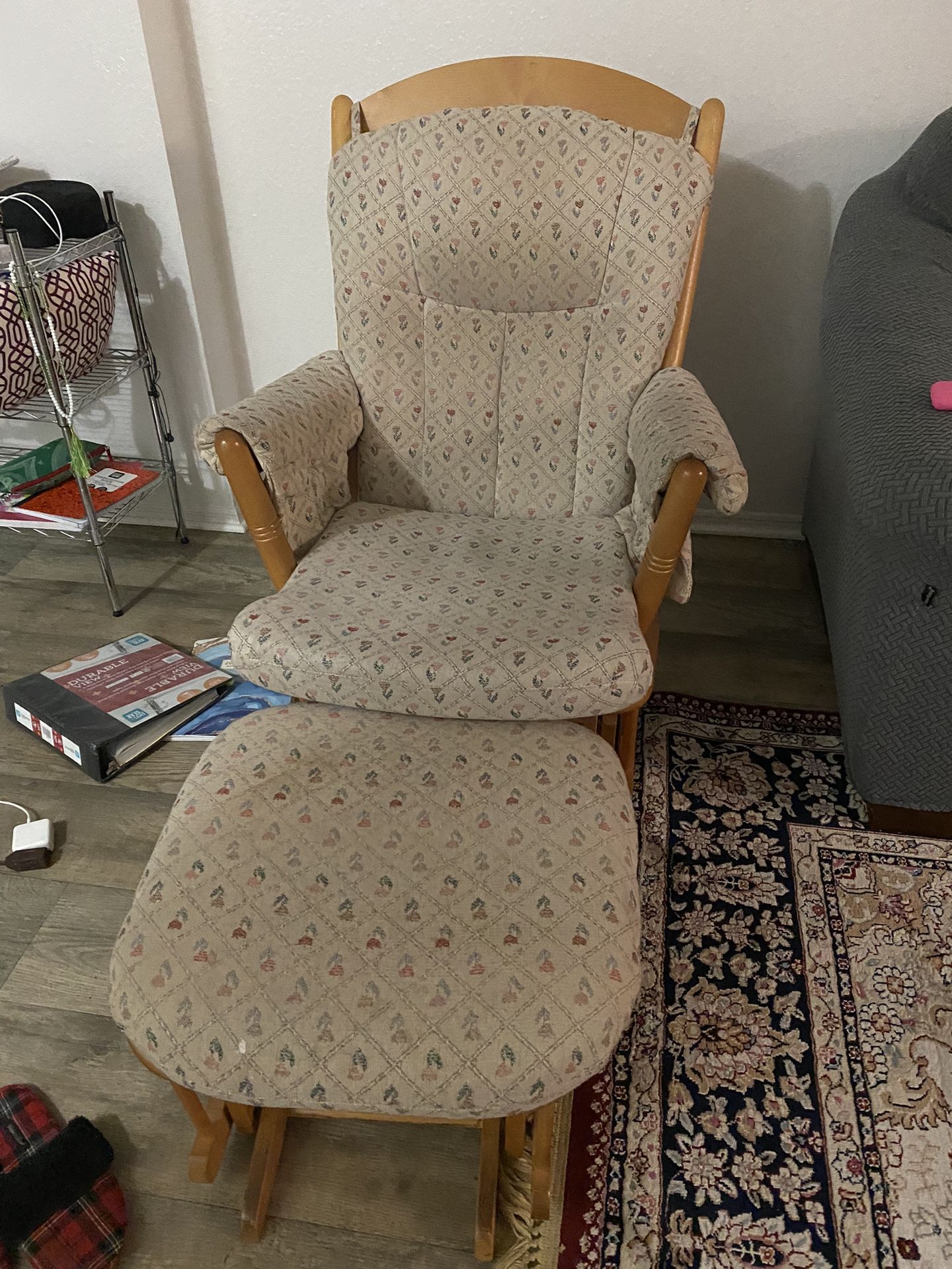 Rocking chair like new. No stains and does not make any noises. Rocks smoothly and very vintage looking but in great great condition.