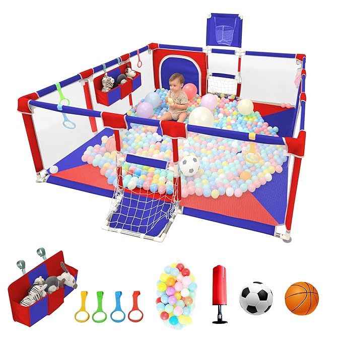 Brand new in box, never opened Baby Playpen,73"X71" Playpen for Babies and Toddlers,Baby Fence Play Area,Safety Indoor&Outdoor Large Playpen with Ocean Balls Baby Playpen】Baby Playpen comes with good quality stainless pipes, 4*Pull Up Rings, 50*Ocean Balls, 1*Basketball Balls, 1*Basketball hoop,1*Football and 2*Football Nets, 4*non-slip suction cups at the bottom,1*Inflator and 1*Storage Bag and 1*Installation Manual. football nets and basketball hoop can help the baby do some sports, and the 4* hand pull ring can help the baby learn to walk. Also come with a external storage Bag to store sundries or small items. 【Quick Assembly & Safe Design】Our baby playpen adopts steel tube sleeve has protective cotton to better protect the baby. play pen for toddlers 1-3 is made of thicker fabric, which will not cause the problem of fabric tearing. Steel tubes and corners are covered with thickened cotton and Oxford cloth.thickness rust-proof alloy tube and T-shaped ABS connector seamless splicing. Stable snap design, easy to disassemble and assemble. The bottom of baby play pen was strengthened with 6 TPR suckers. 【360° Viewable Mesh Design】The four side walls of the playpen for babies and toddlers are made of visible breathable mesh, there is no danger of pinching. the baby can easily see you through the playpen and feel safe, and you can easily grasp the baby's movements. The baby gate playpen adopts an external zipper design to prevent the baby from being hurt by sneaking away. The bottom is made of abrasion-resistant, non-slip, breathable, and easy to clean Oxford. 【Safe Play Pens for Babies and Toddlers】When baby starts crawling or standing, we always need to keep an eye on the baby's movements at every moment to ensure safety. But when we are home alone and need to do housework or other things, no one can help to watch the baby for a while. Then a baby playpen will be the best solution. Our playpen for babies and toddlers is large enough for your little one to learn, explore and play freely 【Multipurpose Baby Play Pen】Our baby play yard has many uses, you can play football or basketball with your child in the baby pen to enhance your bonding with your child.
