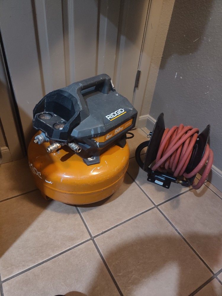 Rigid Air Compressor 6 gallons 150 psi works great comes with mountable air hose.