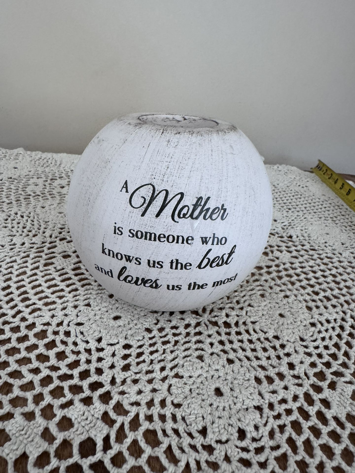 Decorative ceramic tealight candle holder with a sentimental quote: “A Mother is someone who knows us the best and loves us the most.” Made by Pavilion Gift Company. Designed for tea light candles only (see original safety label). Rustic white finish with intentional distressed look. Perfect as a small home décor accent or a thoughtful Mother’s Day gift. Condition: good, light distressed finish as designed Material: ceramic Use: tealight candle only (not included)