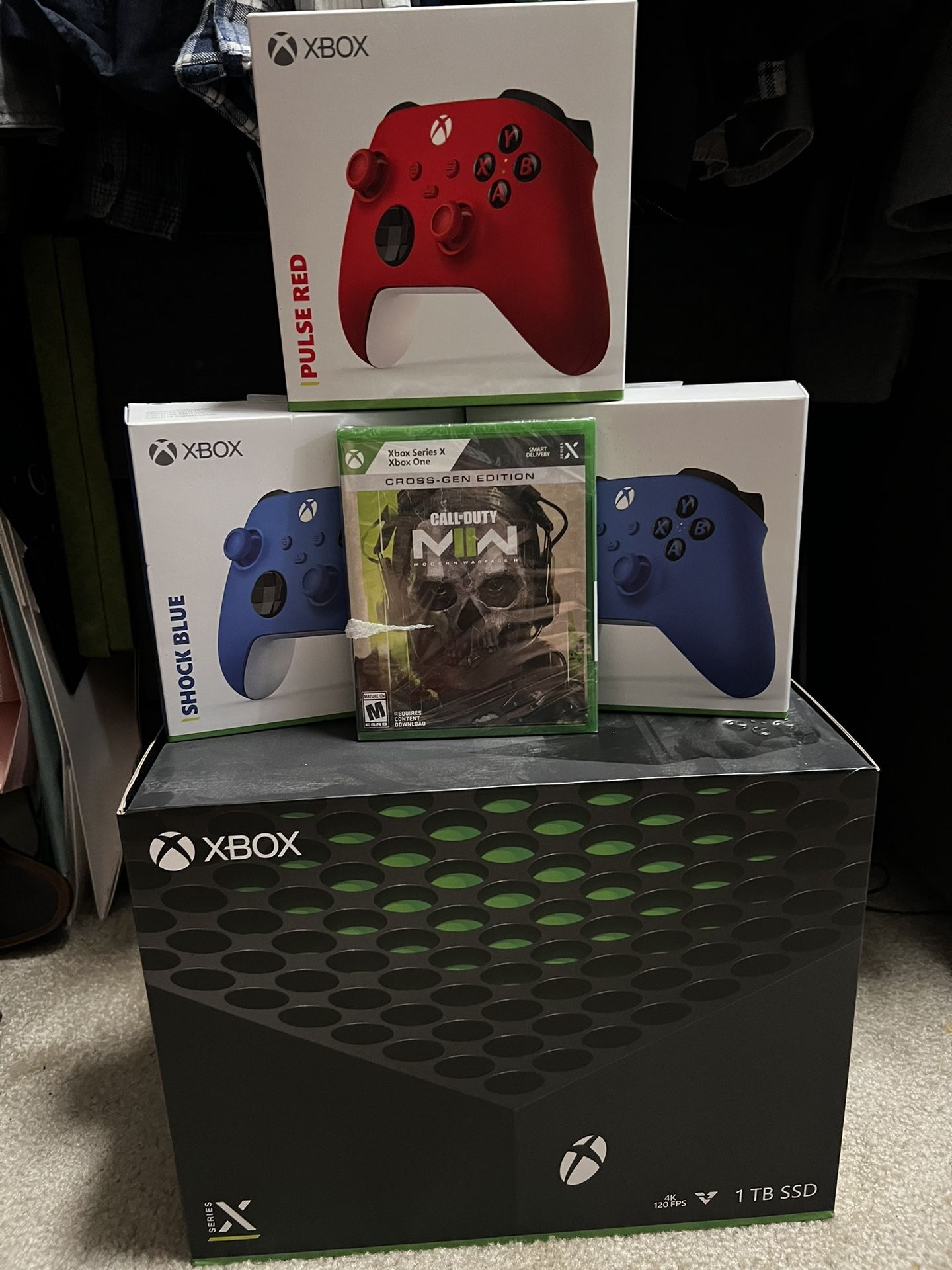 Brand new Xbox series X console never been open with 4 wireless controllers and 1 video game. Original Xbox controllers 2 blue , 1 red, and 1 black and Call of Duty: Modern Warfare II (cross-gen edition.) Everything is brand new nothing has been open. Please only serious buyers