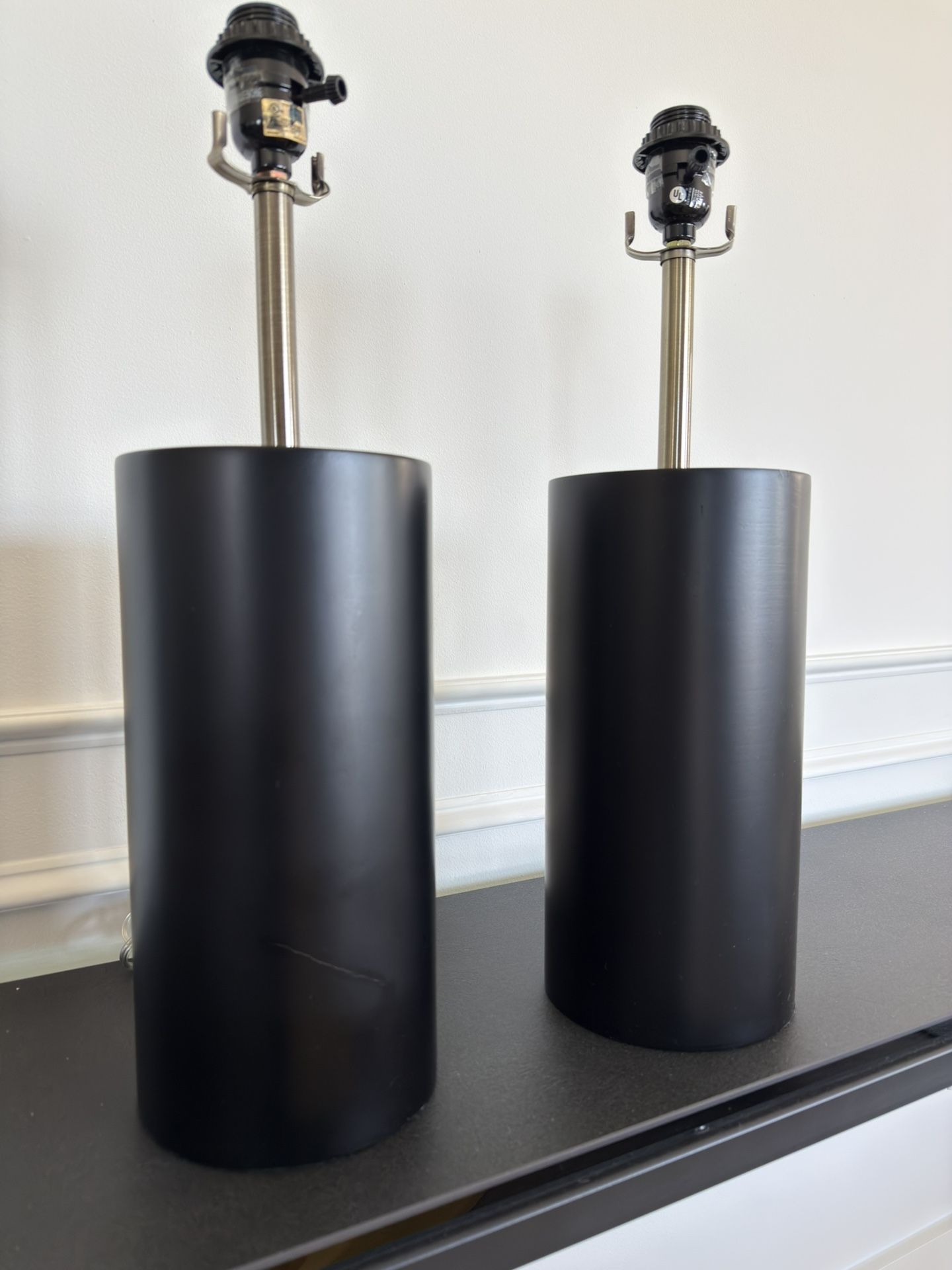 MOVING SALE TWO 20” high table lamp bases priced to sell. 1. One base has a minor surface scratch that not visible unless looking up close. 2. Second base has another marking from packaging, but not visible unless looking up close. 3. They both can be easily sanded and (spray) painted your desired color. 4. Price is reflective of these markings. 5. Shades not included. $75 for both - OBO Buyer must pick up