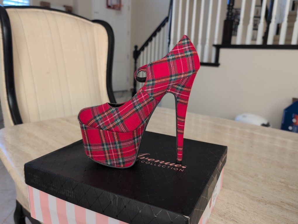 6.5" Red Plaid Stiletto Mary Jane Heels With 2.5" Covered Platform Size 6 By Leg Avenue