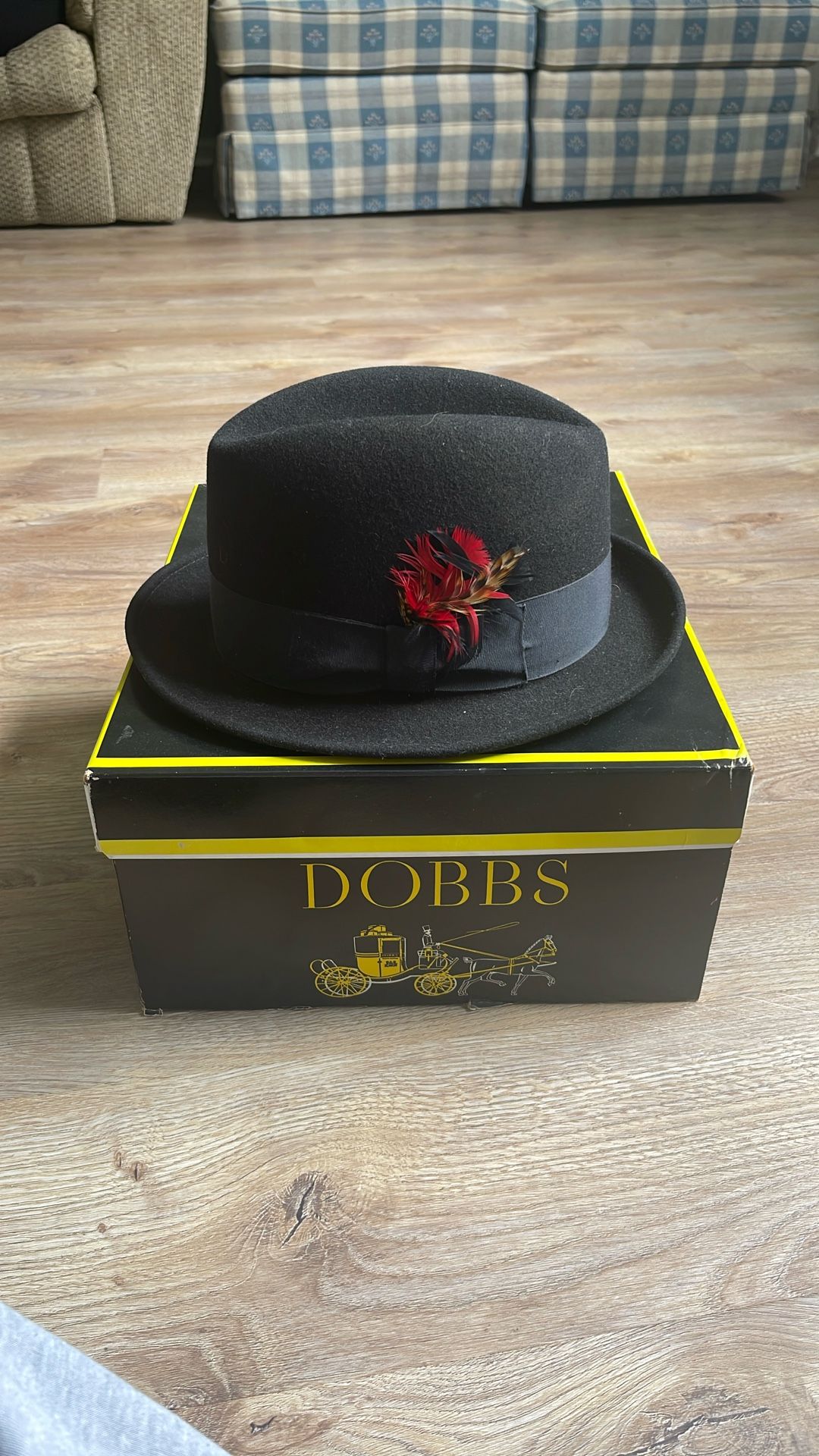 Size 7 1/4 In perfect condition All black with a black bow and red feather