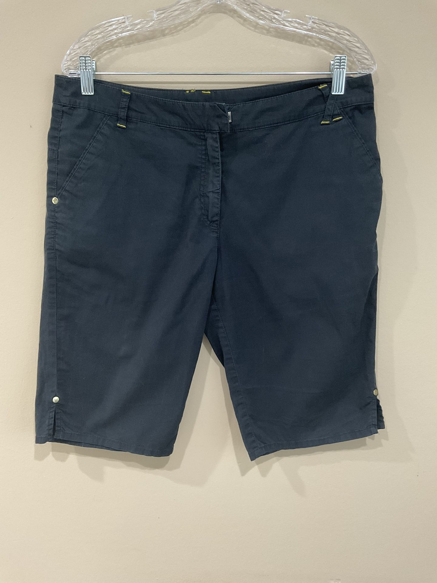 Slightly stretchy, side slits and buttons adorned with brand logo gold buttons, 21” long, 17.5” waist, inseam 11”, very good condition