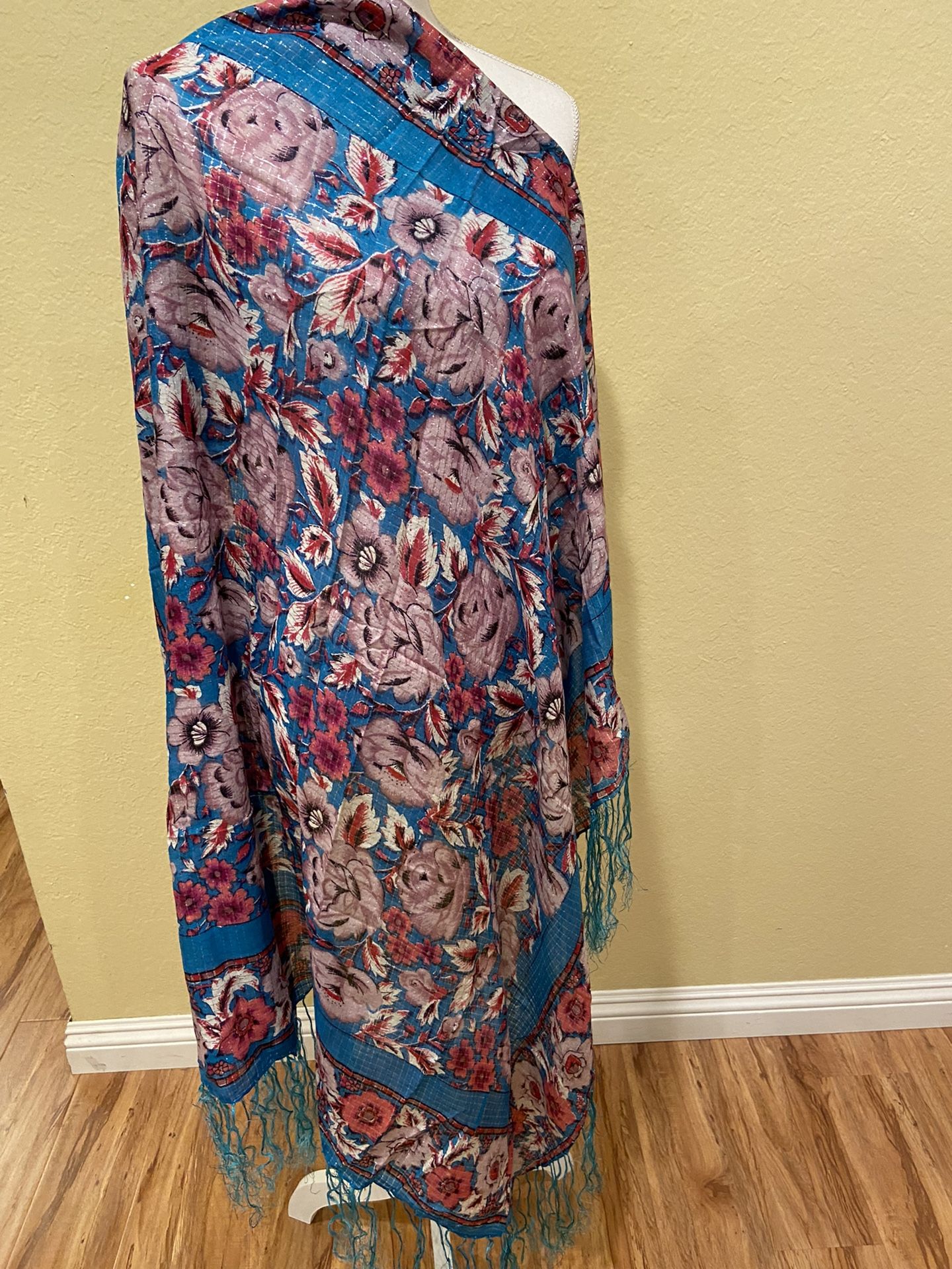 Vintage Scarf Shawl Silver threads Fringe 42”x42”