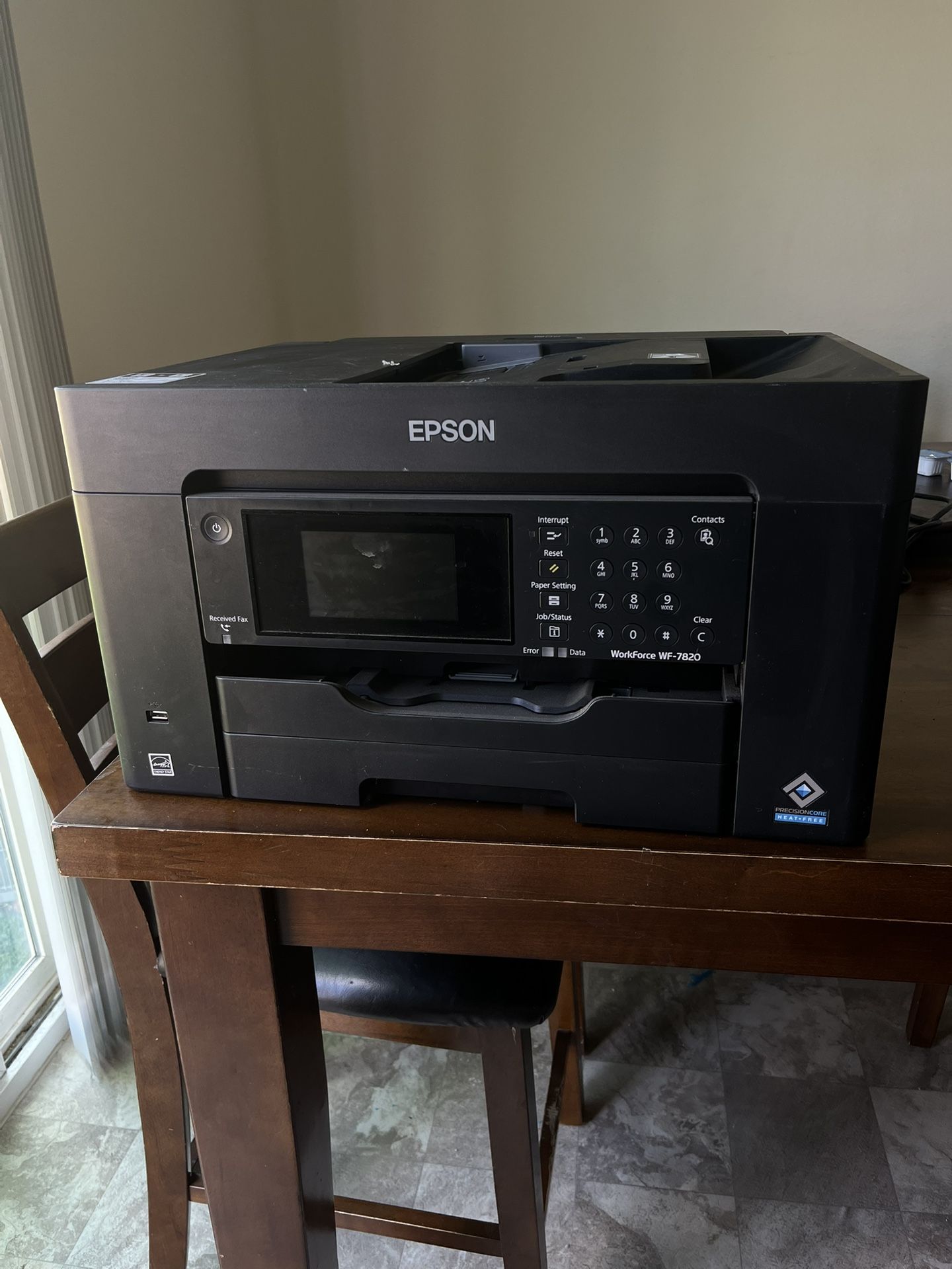 The Epson WorkForce Pro WF-7820 is a wireless all-in-one printer that can print, copy, scan, and fax. It can print on paper up to 13" x 19" and has a 50-sheet ADF. It uses PrecisionCore Heat-Free Technology and DURABrite Ultra inks to print at 25 black/12 color ISO ppm.
