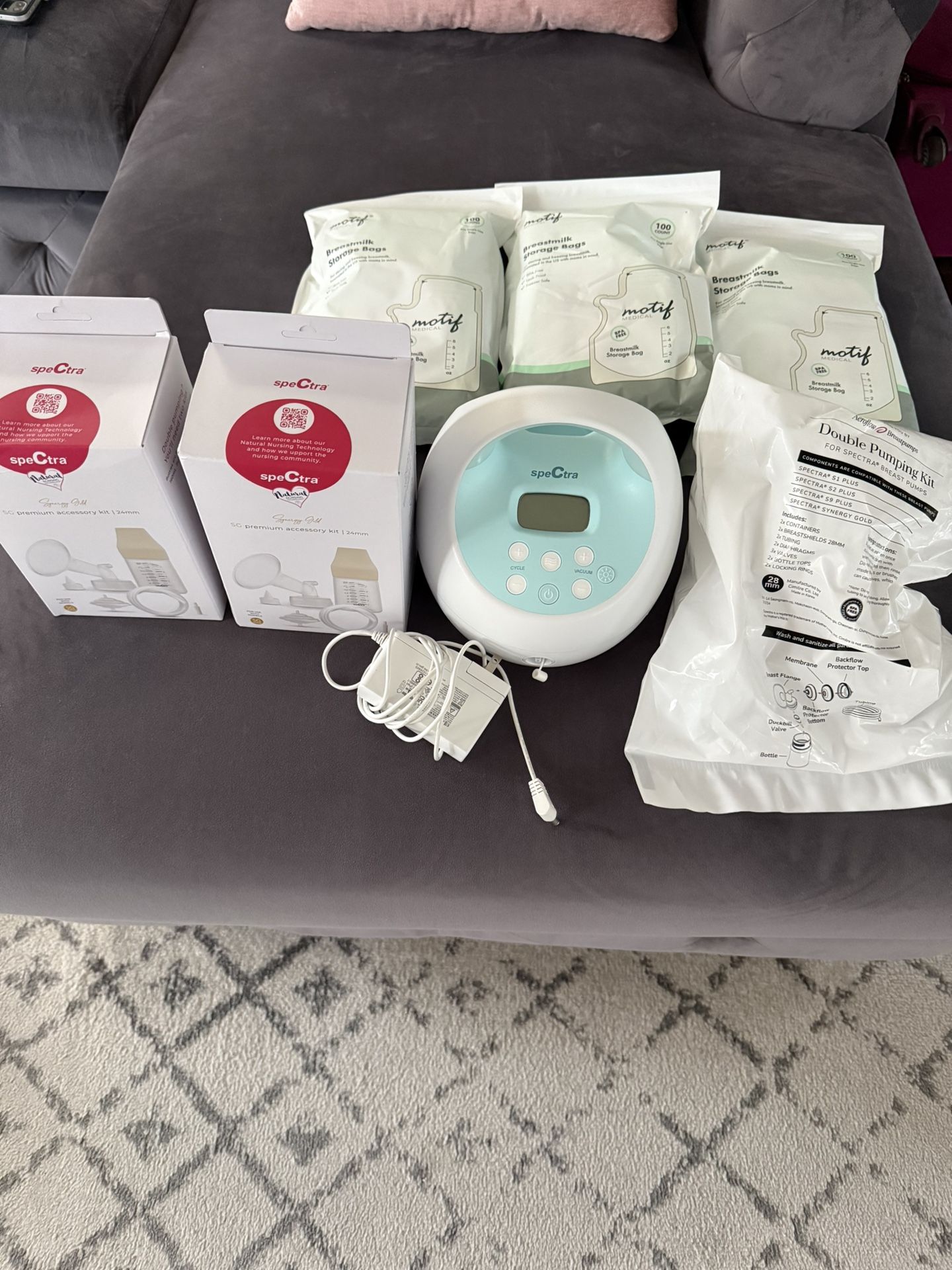 Barely used for 2 months. Spectra S1 breastpump, gently used for couple of months. Comes with brand new/unopened pump parts in 2 sizes: size 24 & 28 mm. Additionally including brand new 300 count Motif breastmilk storage bags.