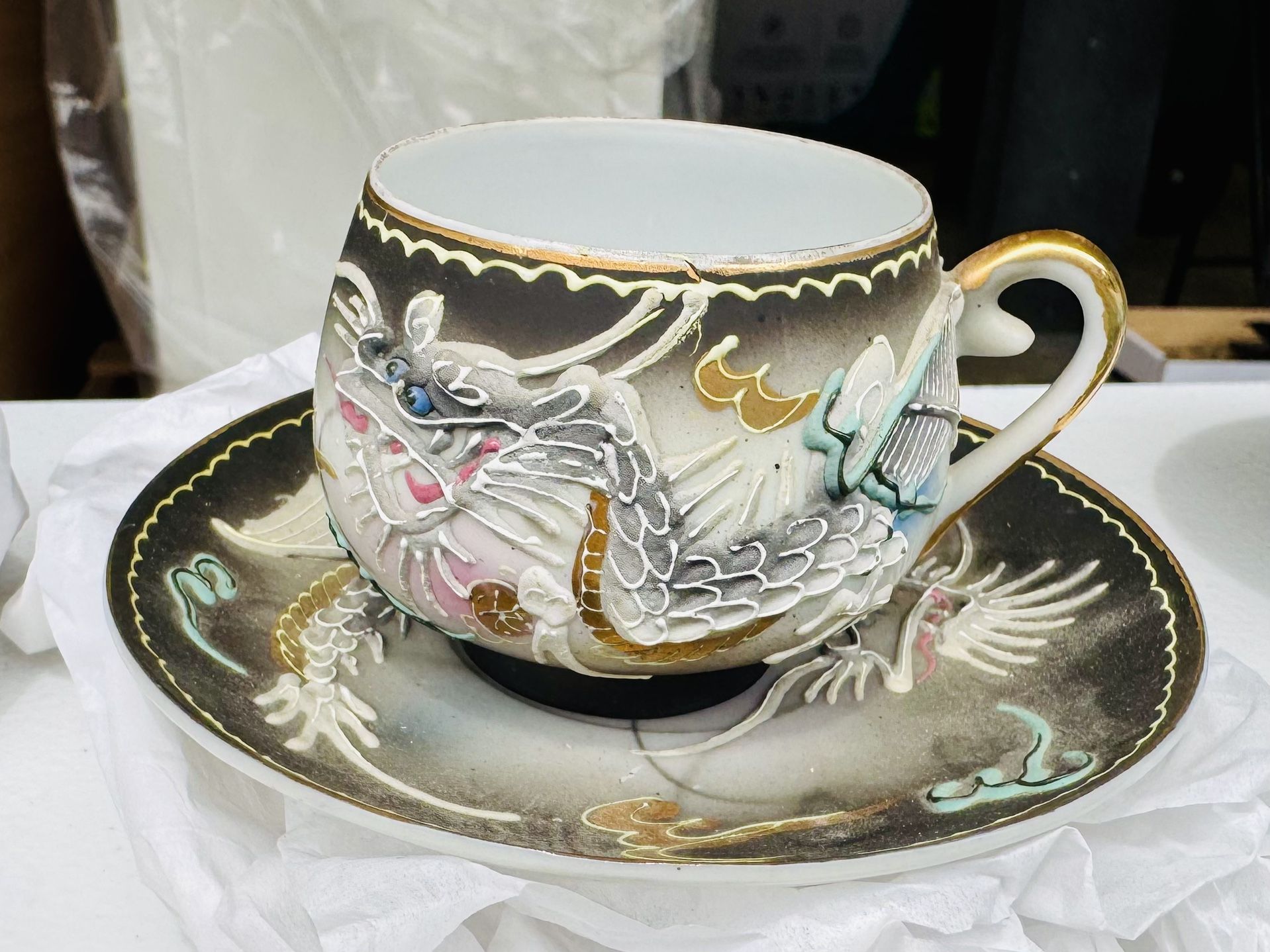 A beautiful antique Japanese eggshell porcelain tea cup and saucer. Had it dated a few years ago and they said it is from the early 20th century. Approximately 1930's. Has a geisha silhouette on the bottom. In mint condition. Beautiful dragon art.