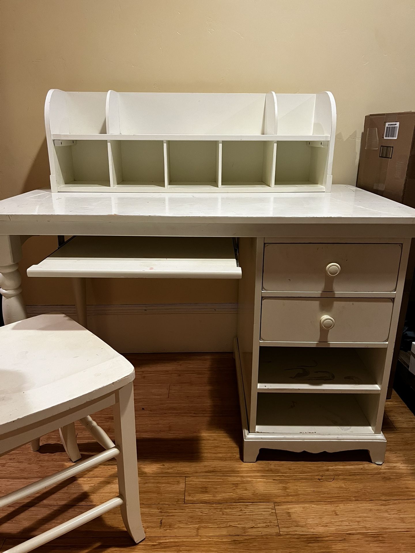 Selling a sturdy white desk with matching chair plus coordinating white bookcase — perfect as a complete study setup for a kid’s room, homework station, or craft space. Desk Details: - Dimensions: 3 ft 10” W x 2 ft 3” L x 2 ft 6” T - Includes matching chair - 2 drawers, 2 shelves - Pull-out keyboard tray - Removable tabletop storage compartment - Has scuffs and craft stains that can be buffed out Desk + Chair Price: $75 Bookcase Details: -29” W x 9.5” D x 5 ft 9” H -5 total shelves (3 adjustable) -Sturdy and functional -Normal wear and tear (see photos) Bookcase Price: $25 Great opportunity to get a full matching workspace setup at a discounted price. Available for pickup only. Accepting cash and Venmo.