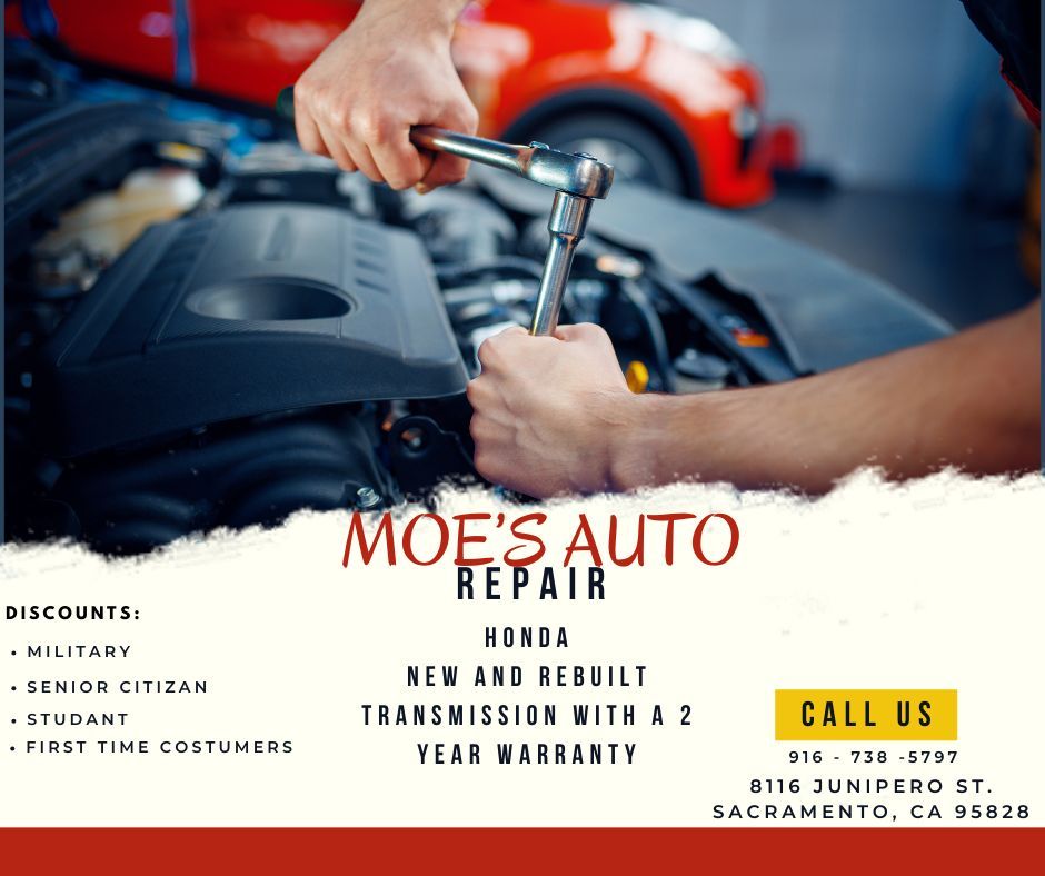 Moe's Auto is providing accessible and reliable in-shop automotive parts throughout the Sacramento and its surrounding regions. Our skilled team utilizes professional equipment and offers complimentary commercial discounts on the majority of parts and transmission replacement. Typical labor costs (common vehicle models): * Alternator * Water pump * Control arms * Struts * Starters * Radiators * Brakes * Hoses * Rotors * Engine replacement * Transmission (Pricing subject to change based on vehicle and job complexity) Prompt and same-day service options are frequently available. Our facility includes complimentary towing services for major repairs. And DISCOUNTS on new customers! Please note that service costs may vary based on vehicle make and model. Call Us Now: 916-738-5797 or 916-821-3819 Licensed And Insured Shop.
