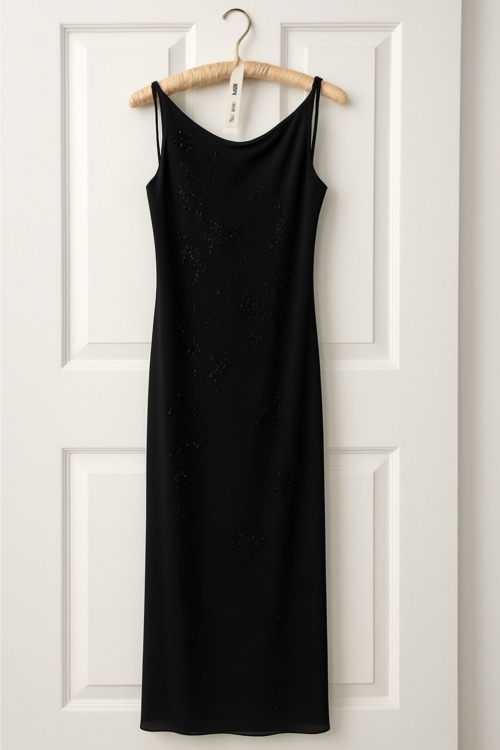 $65 OBO - Elegant Black Beaded Evening Gown, Floral Embroidery