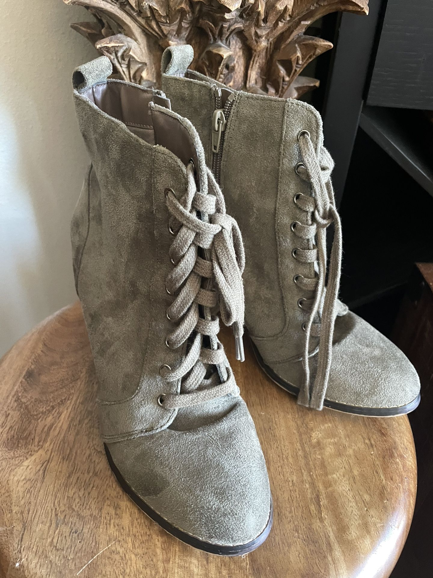 Candies Couture Faux suede lace up block heel ankle boot olive green definitely has a vintage vibe and super cute Has lace up look but has inside zip size 9.5 medium Will meet in shoreline