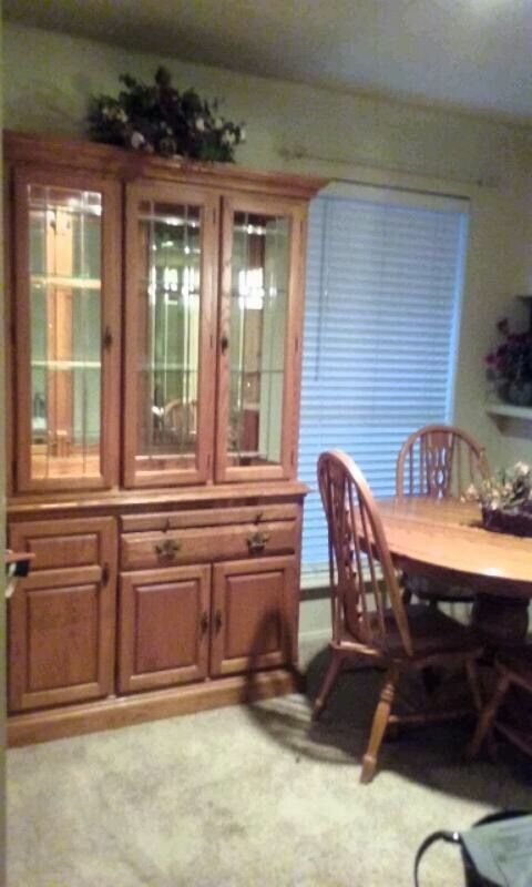 Solid oak heavy duty dining room table and matching hutch. Excellent condition π. Hutch has a touch light with 3 settings, 3 beveled glass doors, glass shelves, bottom opens up to more shelving and buffett drawer. No scratches, beautiful set. Classic oak. Dining set has extension piece to make bigger. Dining table measures 46" round with 12" insert to make approx 60" round. Hutch measures 78" tall 18" deep and 48" wide. π