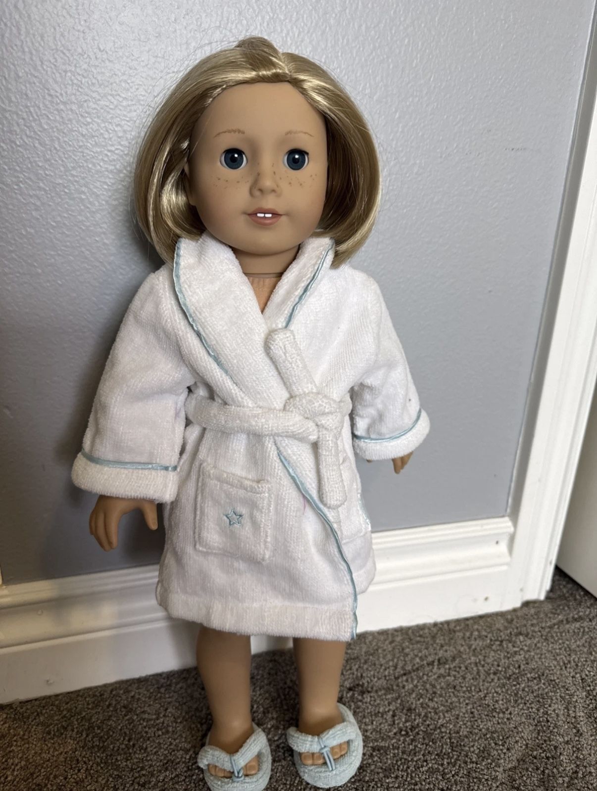 American Girl Doll white robe with blue lining, blue small star on pocket, and large blue star on the back. Includes light blue slippers.