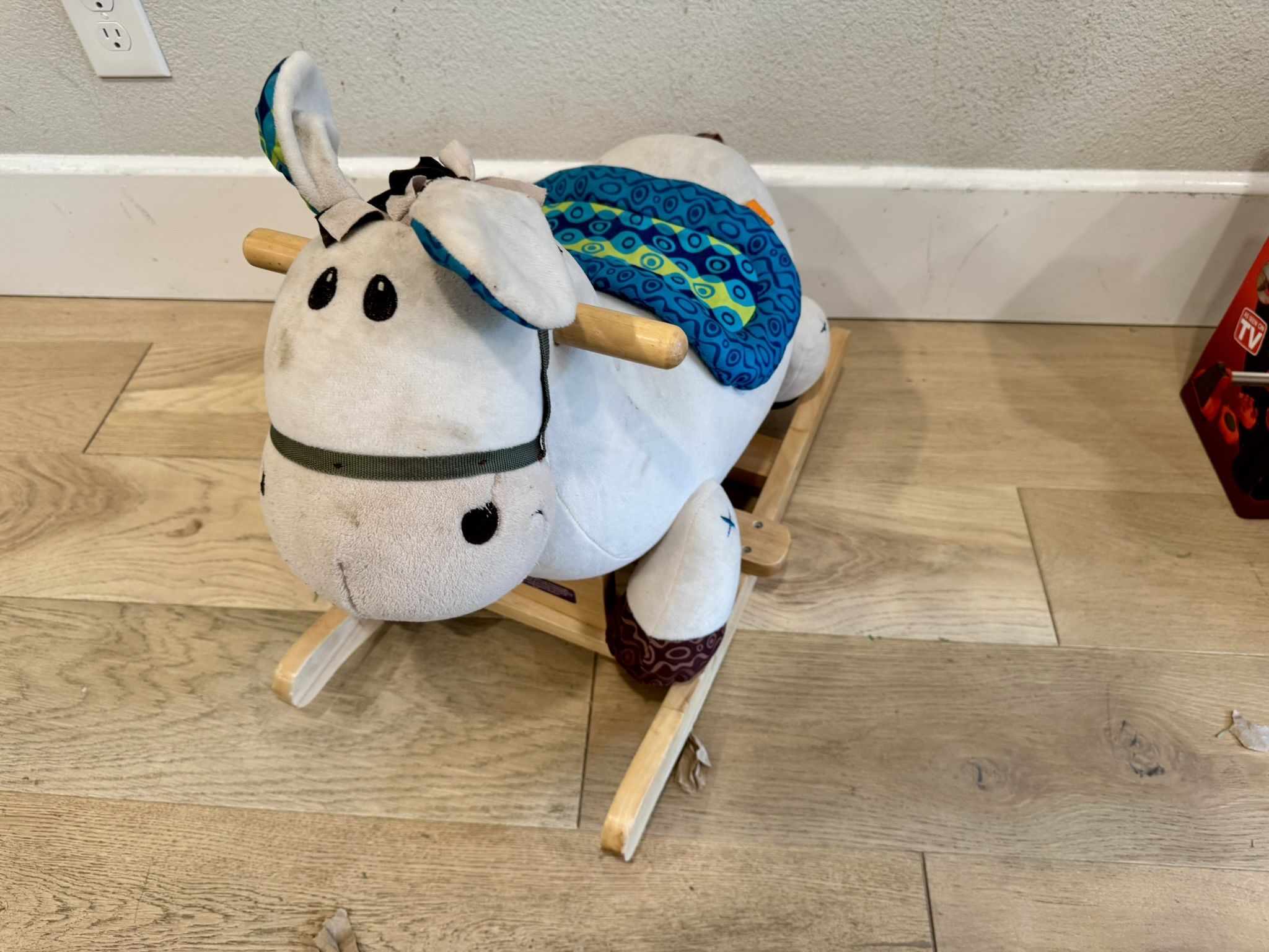 Only used indoors. Makes a cute clack clack sound when ridden. Best for toddlers