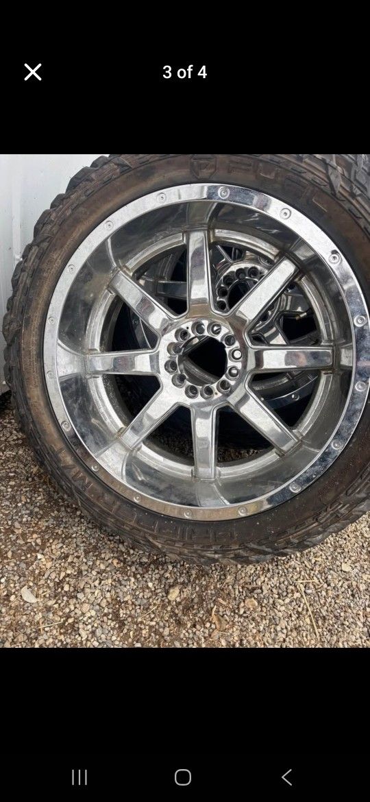 I have three 22x10 Fuel Maverick D536 6 lug universal rims no center caps and two 33x12.50R22 tires im looking to trade for a full set of black 20x10 6x5.5 wheels or 350 cash for each rim and 150 cash each tire