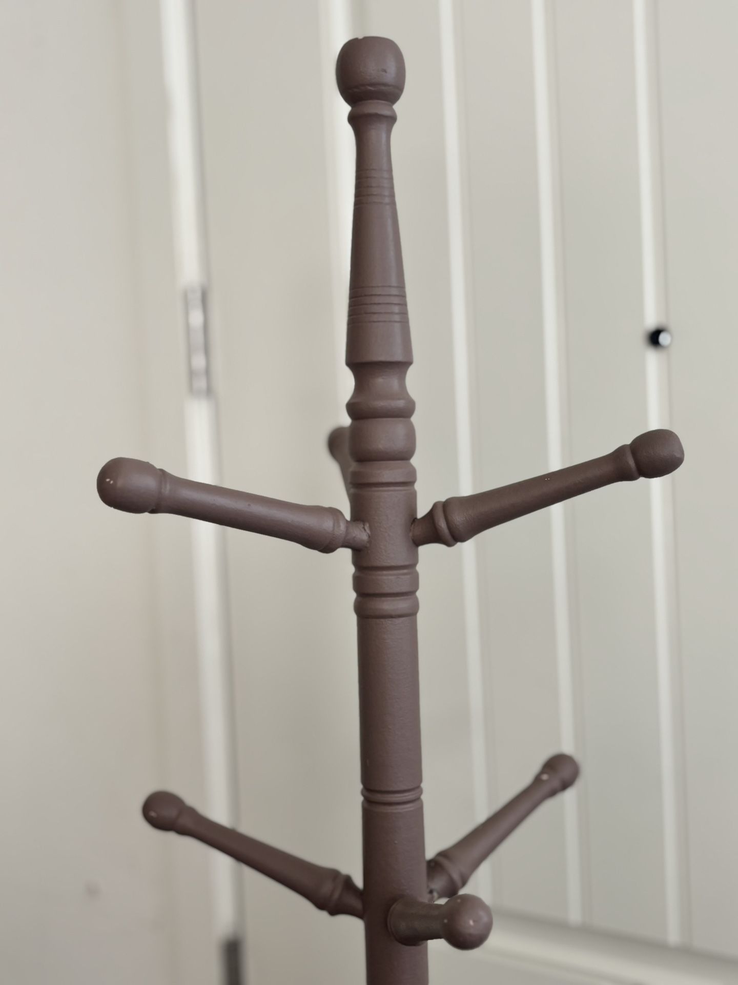 Solid wood coat rack in excellent shape. 6 sturdy hooks for coats, hats, bags, etc. Stable tripod base Clean and ready to use Painted in a deep purple/ dusty mauve Perfect for entryways, bedrooms, or offices.