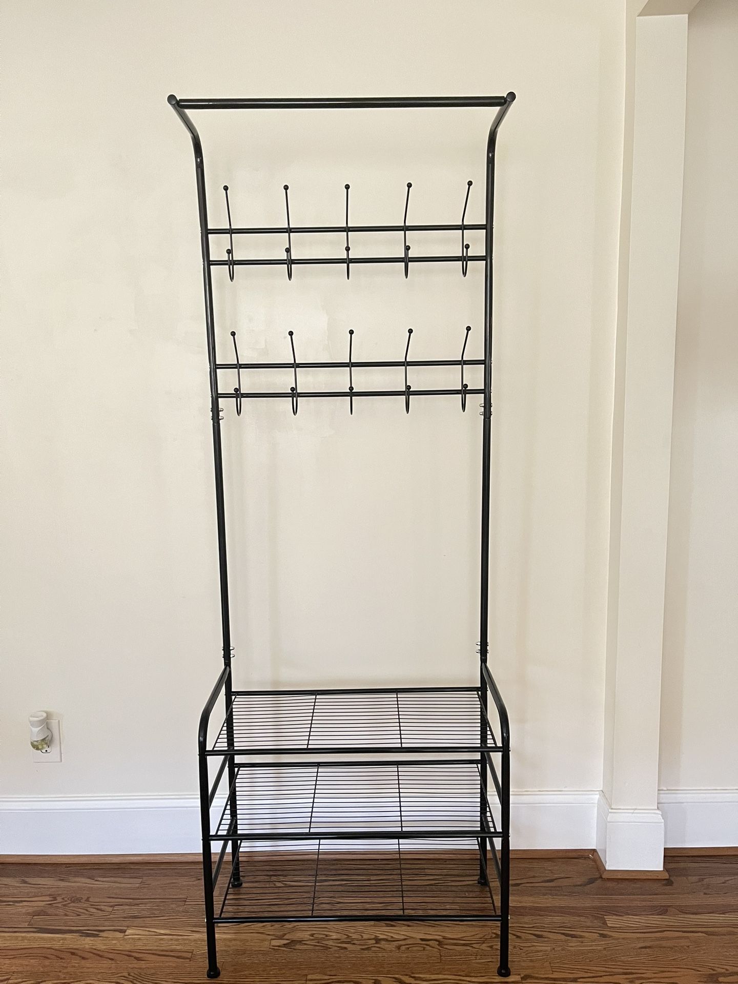 Dual coat and shoe rack. Perfect for the entry way space. Roughly 72 inches tall and 26 inches wide