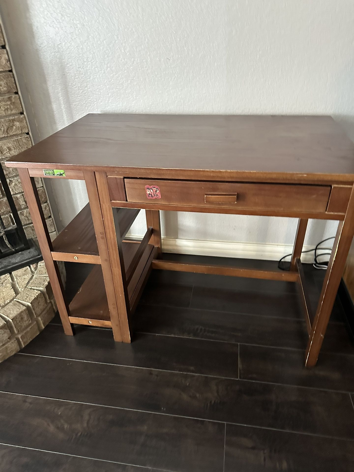 Very sturdy, son used it for a couple of years. Small chair fits fine, it’s not super short - 27 inches tall 36 inches wide 22 inches deep Drawer for supplies, and 2 shelves on left side for storage/organizing $20 or best offer