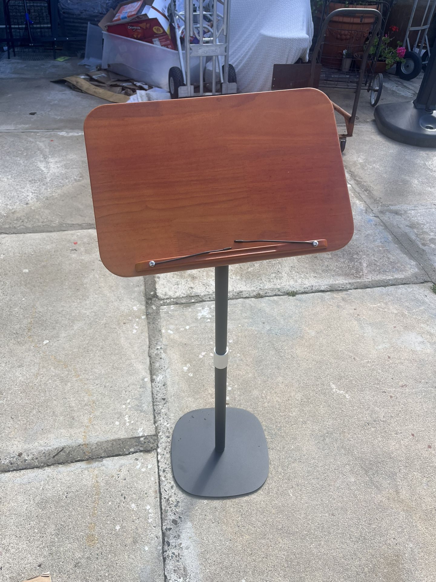 Adjustable Wood Laptop / Reading Stand – Modern Floor Stand Description: Adjustable floor stand with wood top and sturdy metal base. • Height adjustable • Tilting top for reading or laptop use • Compact and stable design Great for laptop use, books, sheet music, or presentations. Clean condition, works perfectly. Price: $60 OBO Pickup Gardena 90247