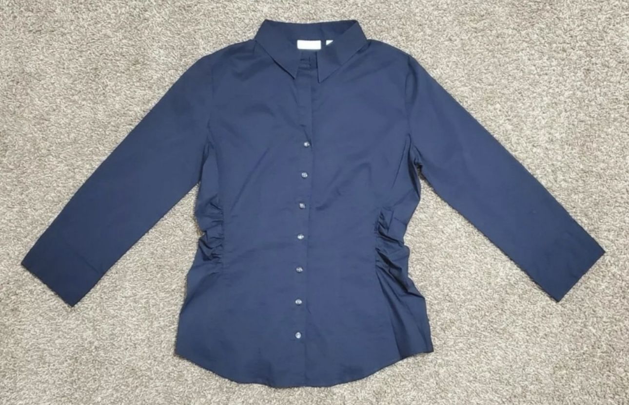 This is a women's New York & Company Stretch ruched button front shirt. It is blue and a size M. This item is pre-owned and in good condition. If you have any questions about this item, please feel free to send me a message. Measurements: Pit to pit - 19 inches Shoulder to hem - 23 inches Top of collar to hem bottom - 27.5 inches Shoulder to bottom of cuff (sleeve) - 20.25 inches