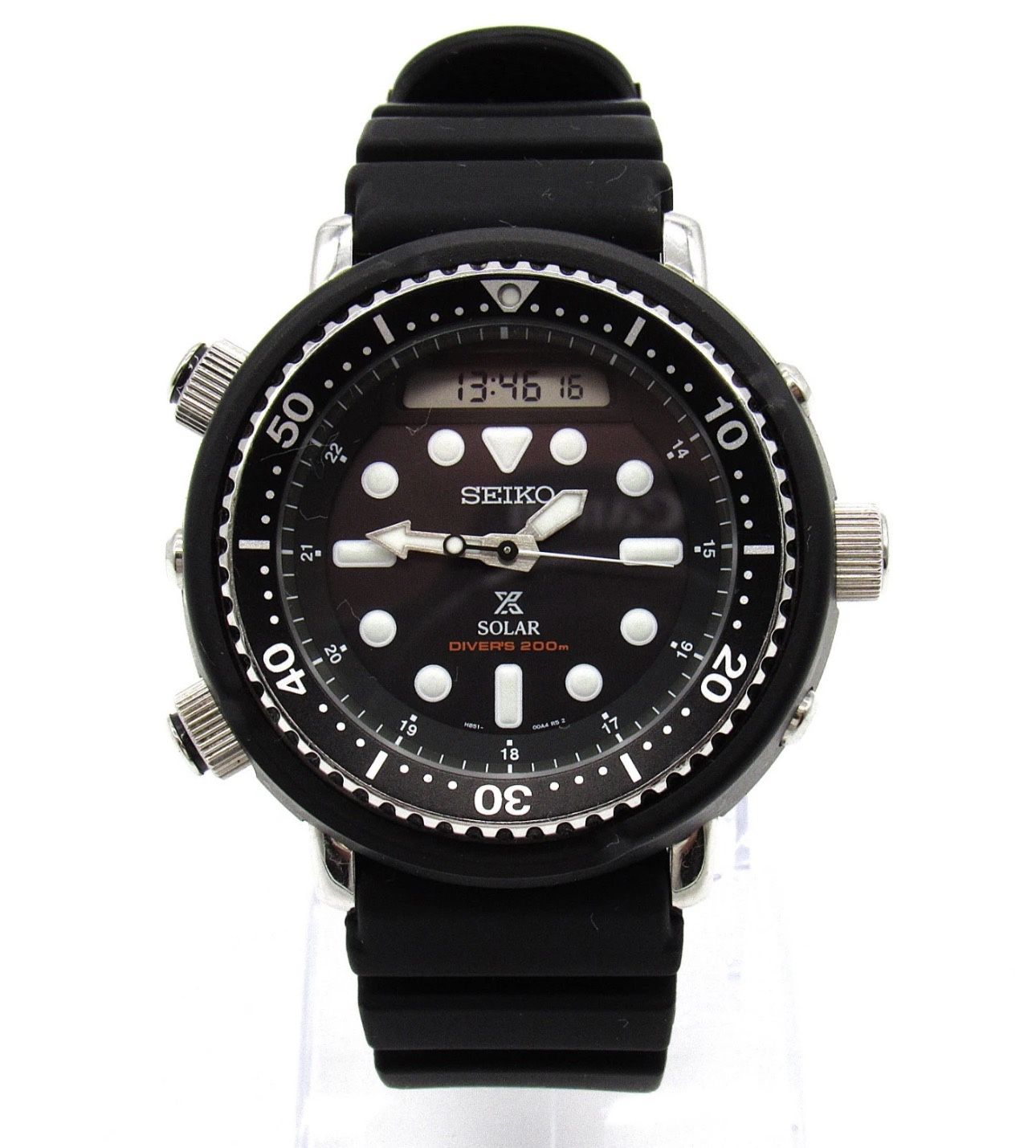 Pre-Owned Seiko Prospex Solar Analog-Digital Diver Watch SNJ025 (H851-00A0) This pre-owned Seiko Prospex SNJ025 “Arnie” is a robust and highly regarded professional diver’s watch, combining classic Seiko dive heritage with modern solar-powered technology. Designed for serious underwater use, this model features Seiko’s reliable H851 solar quartz analog-digital movement, delivering excellent accuracy with no battery changes required. The watch features a bold black dial with luminous hands and markers, paired with a unidirectional dive bezel for precise timing. The integrated digital display provides added functionality while maintaining excellent legibility. The stainless steel case is protected by a black shroud, offering enhanced durability and impact resistance. Condition: Pre-owned and in good working order. The caseback and hardware show visible cosmetic wear consistent with normal use, including surface scratches. The crystal, dial, and bezel remain clear and legible. The rubber strap is intact and functional, showing typical signs of wear. Please review photos carefully for overall condition details. Key Features: Seiko H851 solar-powered analog-digital movement No battery changes required (solar charging) 200m water resistance (ISO-certified diver’s watch) Stainless steel case with protective black shroud Unidirectional rotating dive bezel Luminous hands and hour markers Digital display with additional functions Black rubber diver strap with stainless steel hardware A dependable and iconic Seiko Prospex diver, ideal for collectors, enthusiasts, or anyone seeking a rugged tool watch with proven performance both in and out of the water.
