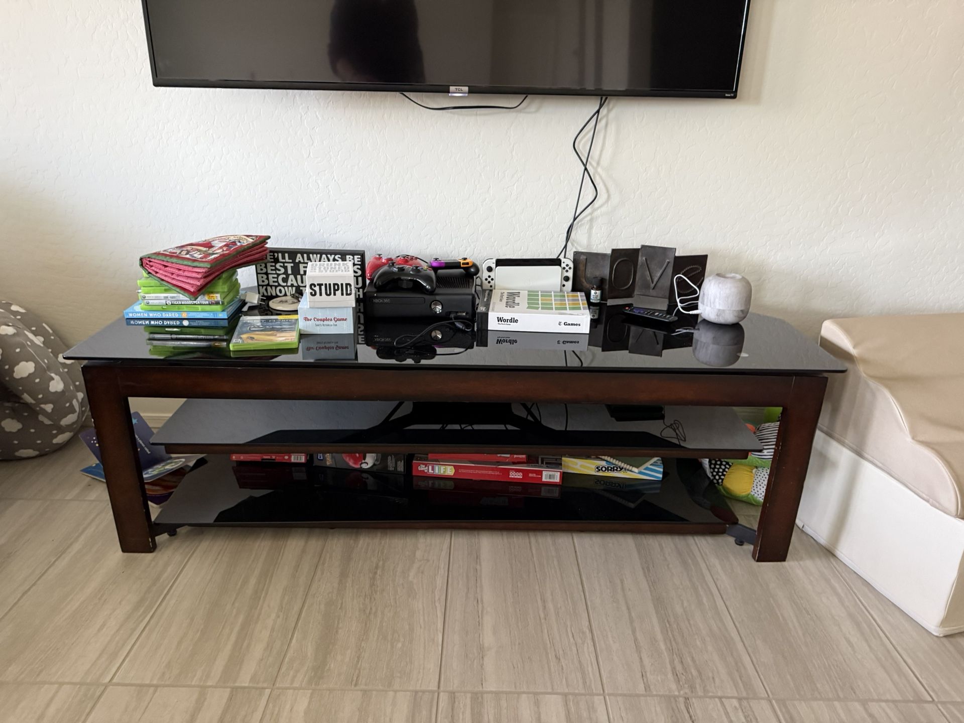 Entertainment/TV stand(only) for sale. It is made of dark metal and wood with dark class shelves. There are three shelves. The stand is heavy and durable. 20”H 23”W 64”L