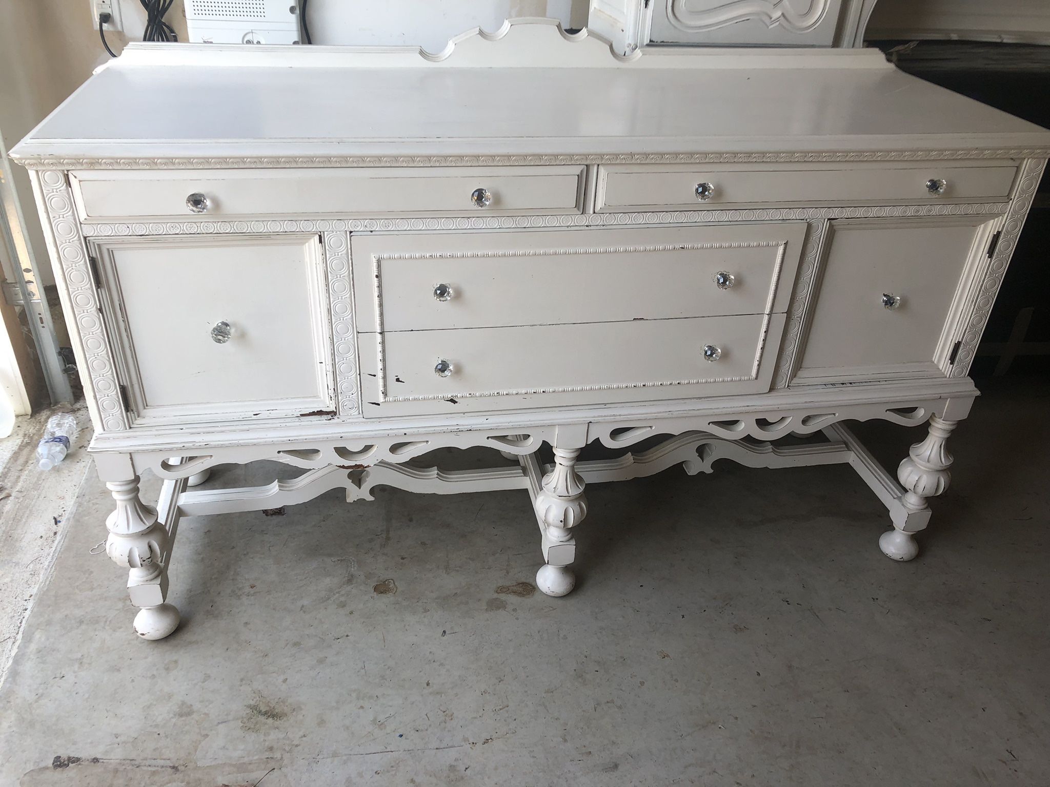 Stunning antique dining buffet credenza with a custom shabby chic finish. I purchased upscale glass / crystal knobs to replace the lighter, acrylic crystal variation the dealer had refinished it with. Various size drawers and working storage compartments with the beautiful knobs make it such a functional look for modern farmhouse, French, shabby chic decor or glam and more decor. It is a very multipurpose piece and at my previous home I actually used it as a dresser in my guest room. Would work for dining room, a bedroom and excellent in a home office as a credenza for storage; SOLIDLY built. Purchased at the historic Mission Inn in Riverside, CA. Dimensions: 37in high x 65in wide and 22in deep. Will discount/bundle price with other listings if interested in more than one item as I have moved and there are multiple/coordinated listings.