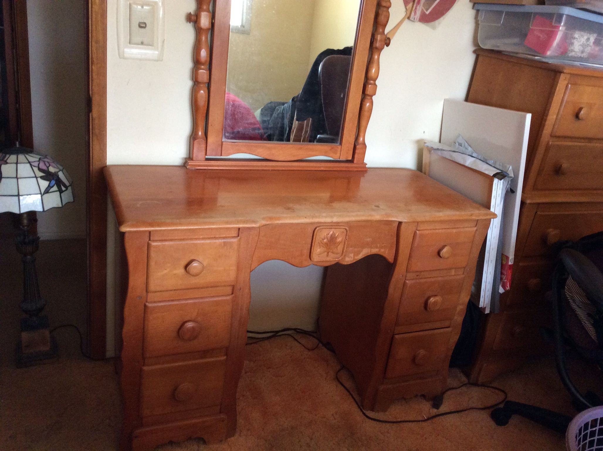 2 twin beds with head and foot boards. ( one Mattress not included. ) Only one twin is showing. 1Side Table,6 Drawer Vanity with Mirror,5 Drawer Dresser. Surface wood wear on these items. Solid Maple wood.