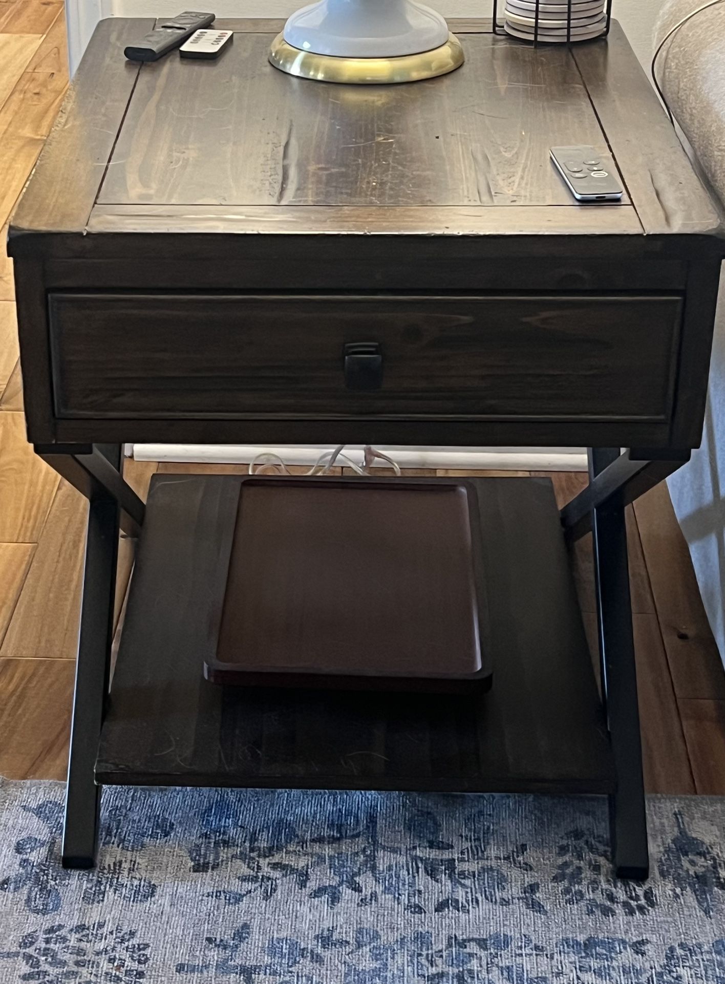 Wooden end table with 1 drawer storage and underneath open storage shelf. Width- 22 in; depth- 26 in; height- 25 inches. Purchased from Haverty’s in 2020.