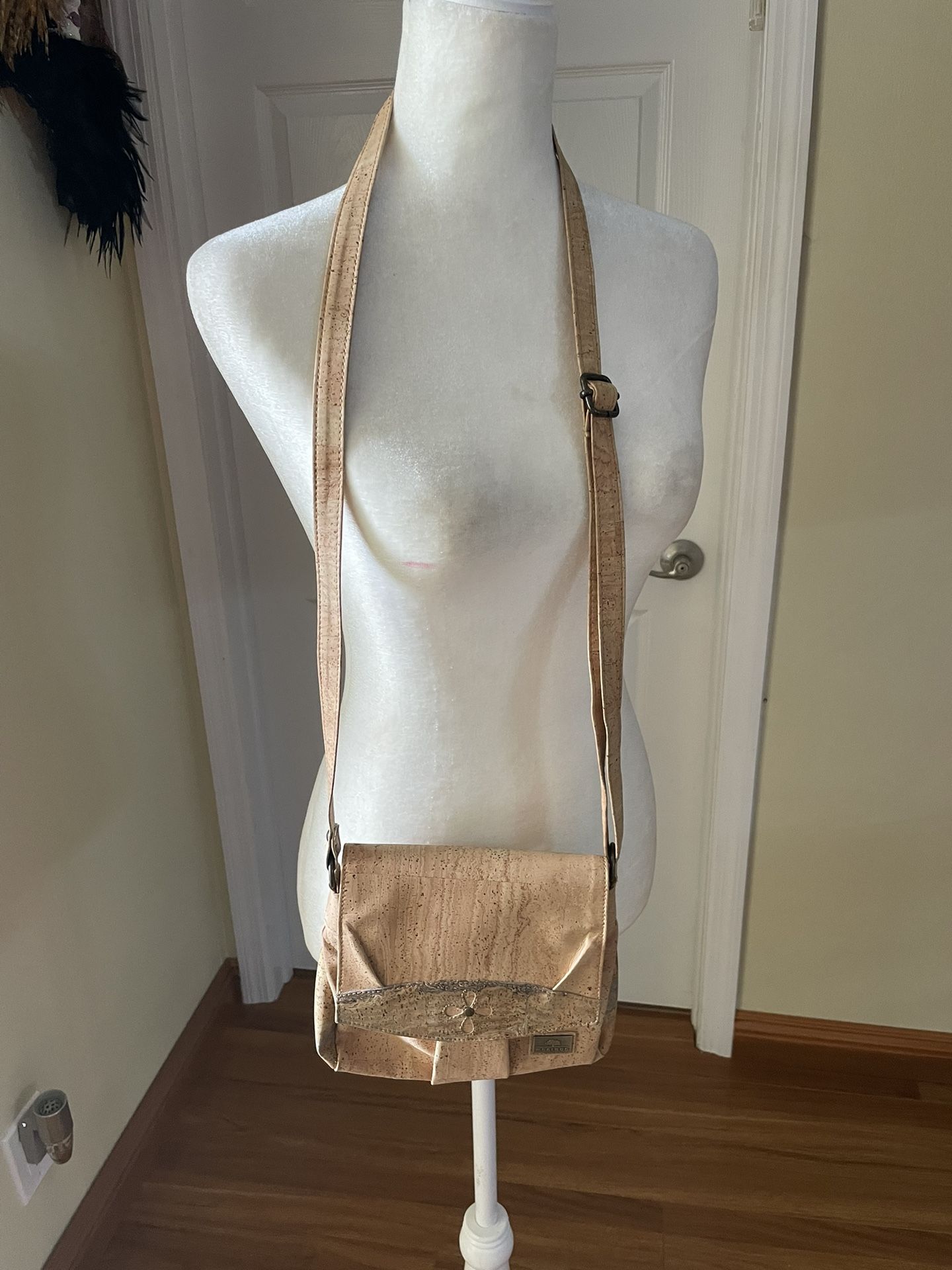 Women’s Crossbody bag beige color, made from Natural corks excellent condition. Inside one department , one zipper pocket, one slide in. Outside zipper pocket, zipper closure and flap top. Long adjustable belt. Made in Portugal.