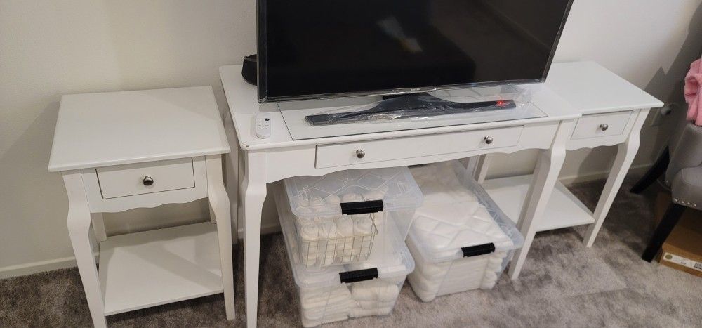 White writing desk with matching end tables. Price is for everything. Separately: $150 for desk and $50 for each end table. Perfect for a dorm room