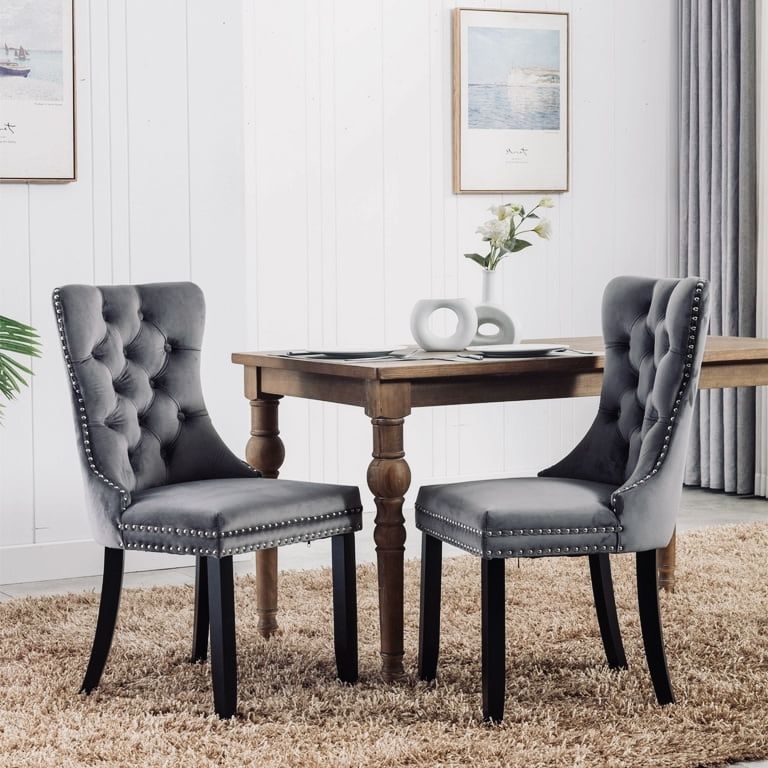 Set Of 2 Velvet Fabric Dining Chairs Luxury Tufted Back with Nailed Trim and Back Ring Pull Home Kitchen Armless Accent Side Chairs