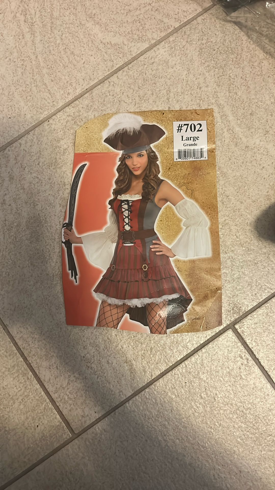 This is great for Halloween or Gasparilla or just play! Comes w Dress size Adult Large, arm sleeves, hat & extra choker or could b a leg garter! Also bought extra leg knife garter! Another extra I got is the little pirate purse sack! So many super cute extras!