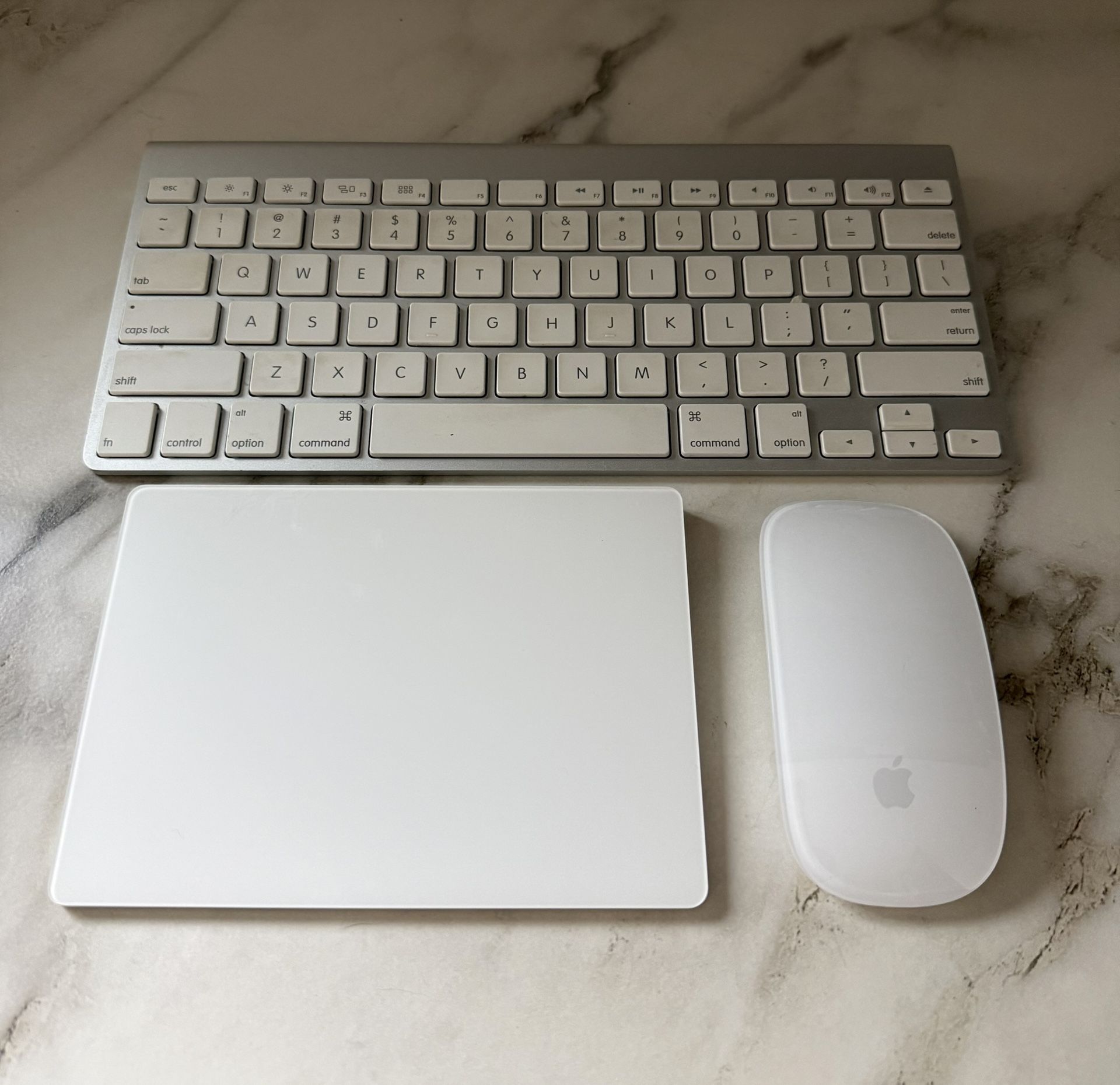 Selling a lightly used Apple Magic Keyboard, Magic Trackpad, and Magic Mouse combo. All three items work great and connect easily via Bluetooth. Great for Mac setups, home office, or creative workflows. Magic Keyboard — some light cosmetic marks on the back, charges via battery Magic Trackpad — smooth and responsive, charges via Lightning cable Magic Mouse — clean and fully functional, charges via Lightning cable