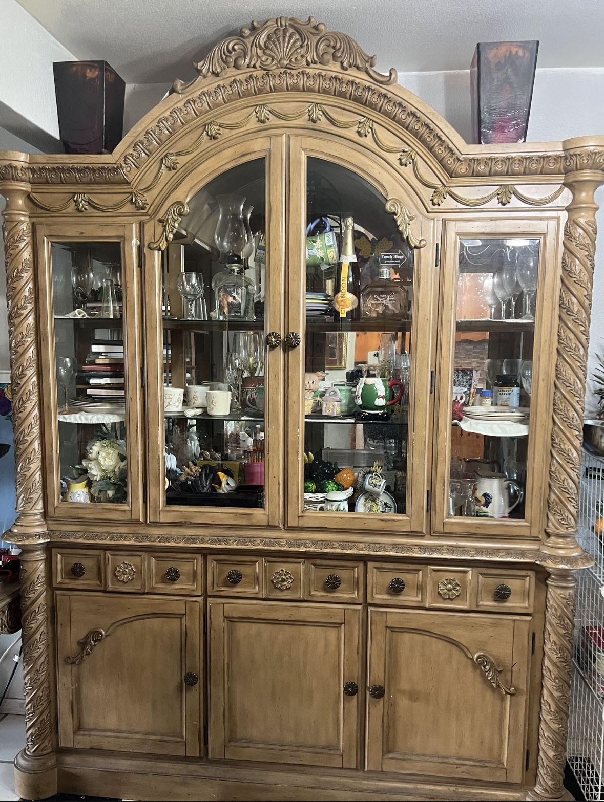 This China Hutch is in great condition. Comes with touch hinge to turn inside light on Drawers open and close smoothly, has lots of space on the bottom drawers. This is a very well made wooden hutch. Can send more pictures upon request PICK UP ONLY