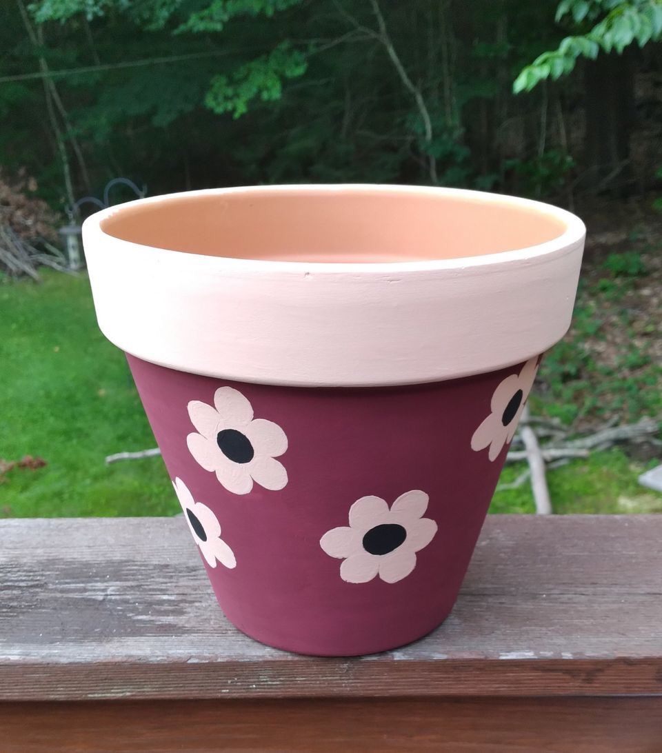 Hand painted terracotta plant pot. Burgundy and coral. Measures 7” tall with a 7.5” top opening and a 4.25” base. Acrylic paints with a finish sealer. Driveway pickup in cape neddick