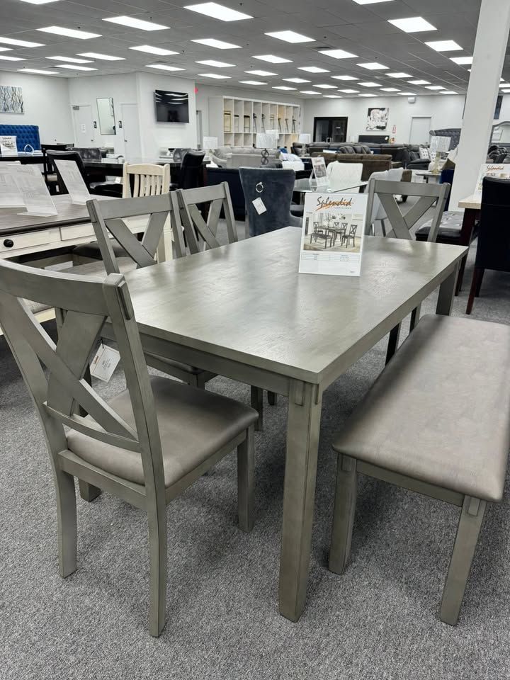 Brand New Elegant Dining Set Includes a table, four chairs, and a bench. X-back wood frame chairs complement the table's understated design. Light, neutral tone seats contrast with the gray finish. Dining Table dimensions: 60x36x30.25 Sale Price: $599.00 Regular Price: $949.00 Includes: Dining Table + 4 Chairs + Bench We offer various finance plans $39 down same as cash with no interest for 90 & 100 days. Longer financing plans are also available. Lowest prices, great quality products and exceptional service guaranteed. We also have a wide range of other living room, bedroom and dining room products to choose from at highly affordable prices. For buying visit Splendid Furnishings located at 4073 Lavista Road, Suite 311, Tucker GA 30084 or call 470-269-9301.