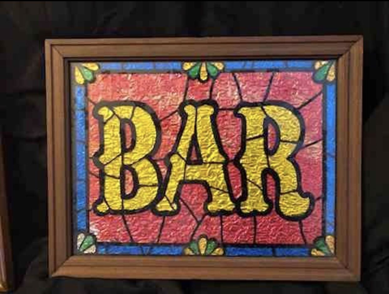 Bright, colorful bar sign with a faux stained-glass look, perfect for a bar, game room, or man cave. Bold yellow “BAR” lettering on a red textured background with blue border and green accents, set in a wood frame. Good condition with vibrant colors and ready to hang or display.