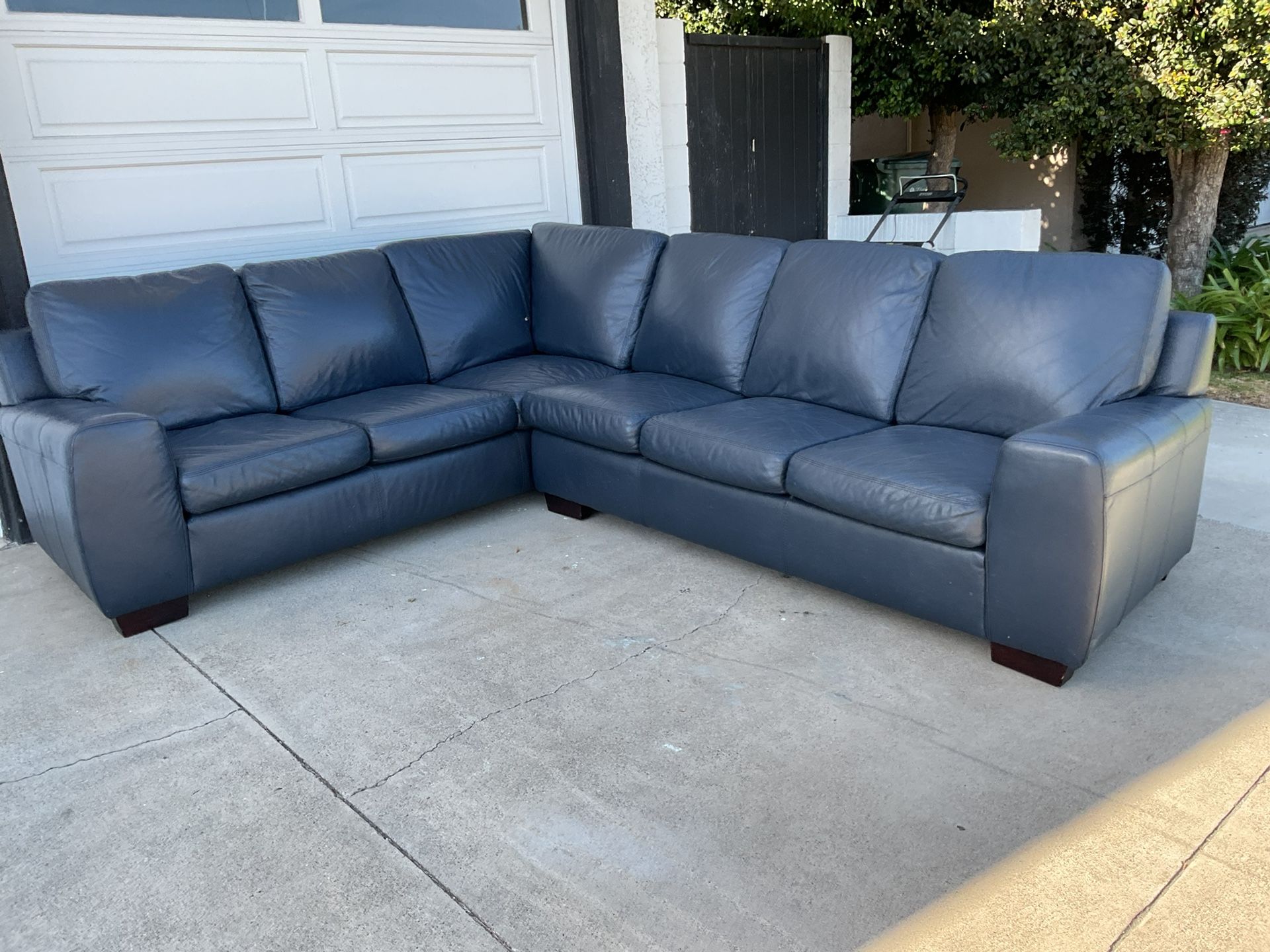 Top grain leather sectional from Jerome’s Furniture. No recliners. Individual pieces measure 90” W x 37” H x 37” D, and 77” W. Navy blue color. Quite lovely.