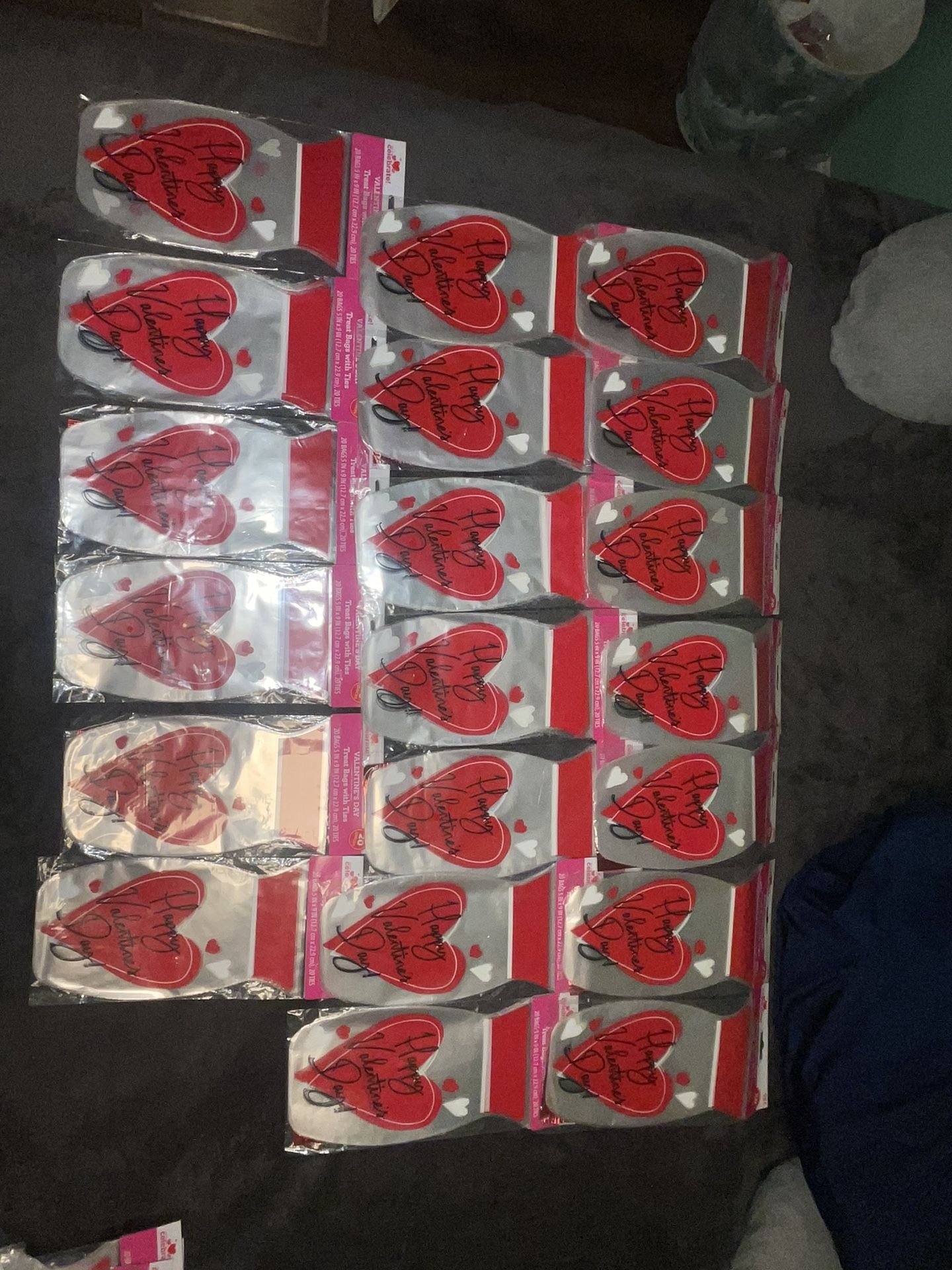Valentines Day treat Bags 20ct Per Bag Closing my from home treat business lots of left over stuff brand new. Valentines day Treat bags -Each bag has 20 bags count inside. 20 bags included including 400 Treat bags. $1 per treat bag of 20 count. It have 54 of these bags. **This listing is for 20 bags. $20